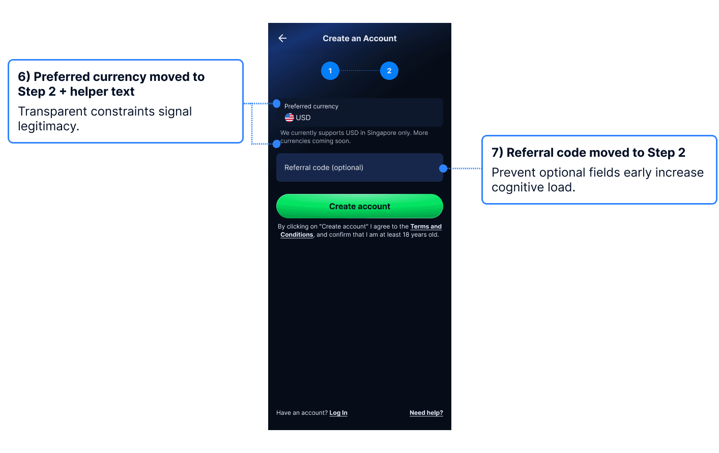 The redesigned experience reduces early cognitive load, clarifies the next action, and guides users step by step toward signup and deposit.