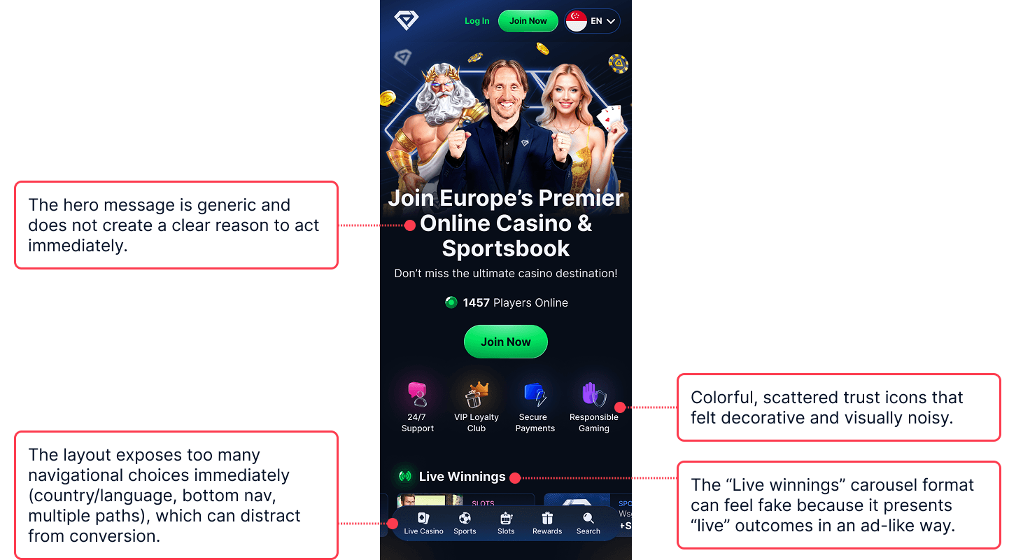 GemBet is an iGaming platform expanding into Southeast Asia. In this independant research, I helped adapt the experience through a targeted UX strategy and redesign focused on trust, clarity, and conversion.