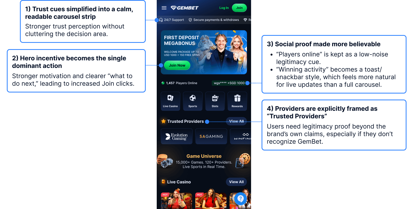 Help GemBet enter the Southeast Asia market with a UX strategy that improves trust, clarity, and conversion. Translate this strategy into targeted design improvements across the landing experience and registration flow.