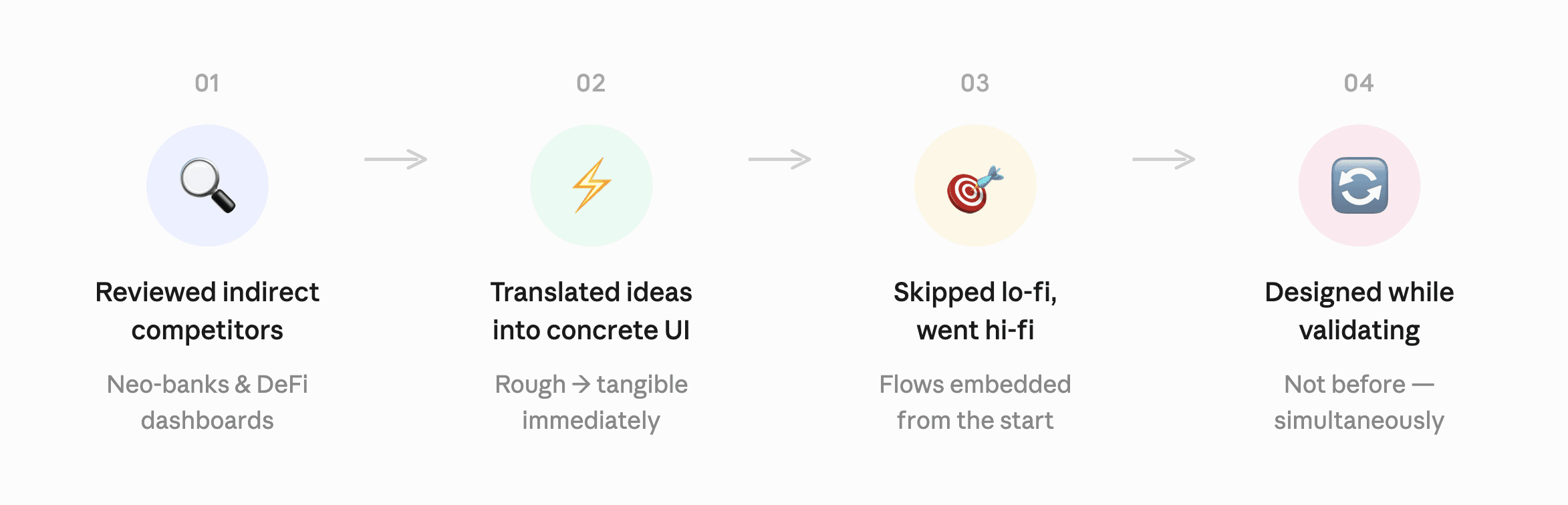 I focused on execution over process. I referenced neo-bank and DeFi patterns, moved straight into high-fidelity with flows, and validated decisions in real time with the founder.